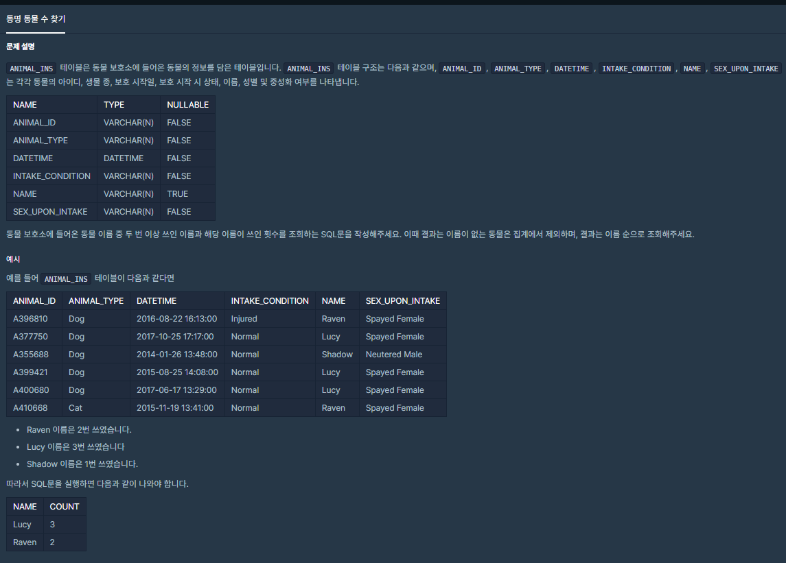 -- 코드를 입력하세요 SELECT NAME, COUNT(NAME) FROM ANIMAL_INS GROUP BY NAME HAVING COUNT(NAME) > 1 ORDER BY NAME728x90