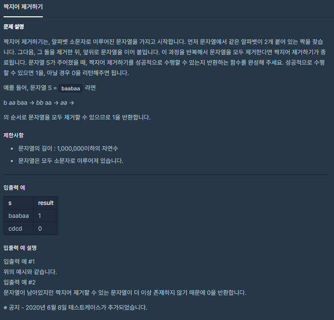 문제링크: https://programmers.co.kr/learn/courses/30/lessons/12973