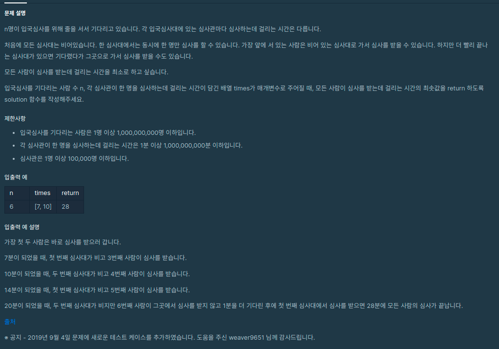 n명이 입국심사를 위해 줄을 서서 기다리고 있습니다. 각 입국심사대에 있는 심사관마다 심사하는데 걸리는 시간은 다릅니다. 처음에 모든 심사대는 비어있습니다. 한 심사대에서는 동시에 한