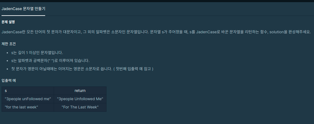 JadenCase란 모든 단어의 첫 문자가 대문자이고, 그 외의 알파벳은 소문자인 문자열입니다. 문자열 s가 주어졌을 때, s를 JadenCase로 바꾼 문자열을 리턴하는 함수, solution을 완성해주세요. 제한 조건