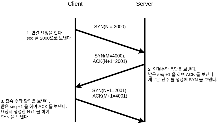 - 3handShake 라고 불리는 이유는 3번 악수를 하는 것처럼 보여서 그렇다. - 1. 클라이언트에서 연결요청 SYN 2000 을 보낸다.