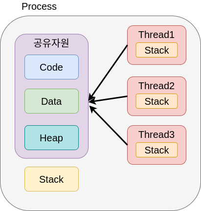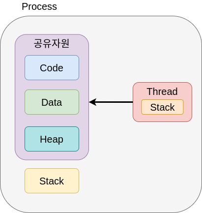 - 쓰레드는 프로세스의 Code Data Heap 을 공유자원으로 사용한다.