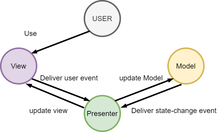 - View 와 Model을 연결해 주는 역할은 Presenter가 담당한다.