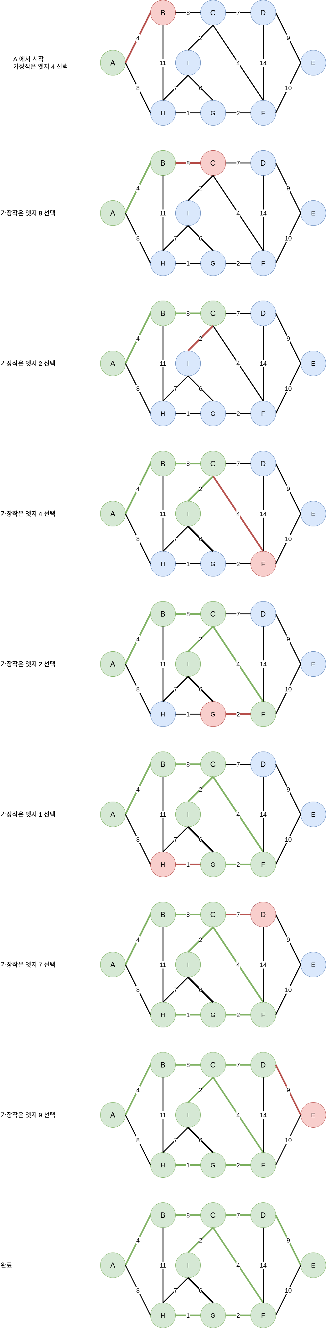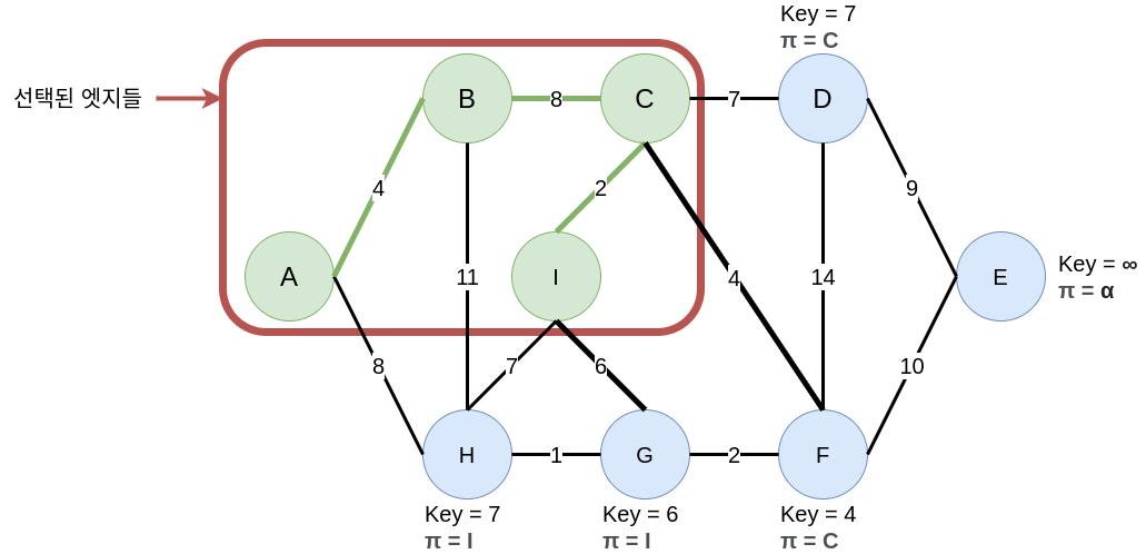 - H 를 기준으로 설명하면 현재까지 선택된 노드들(A,B,C,I) 중