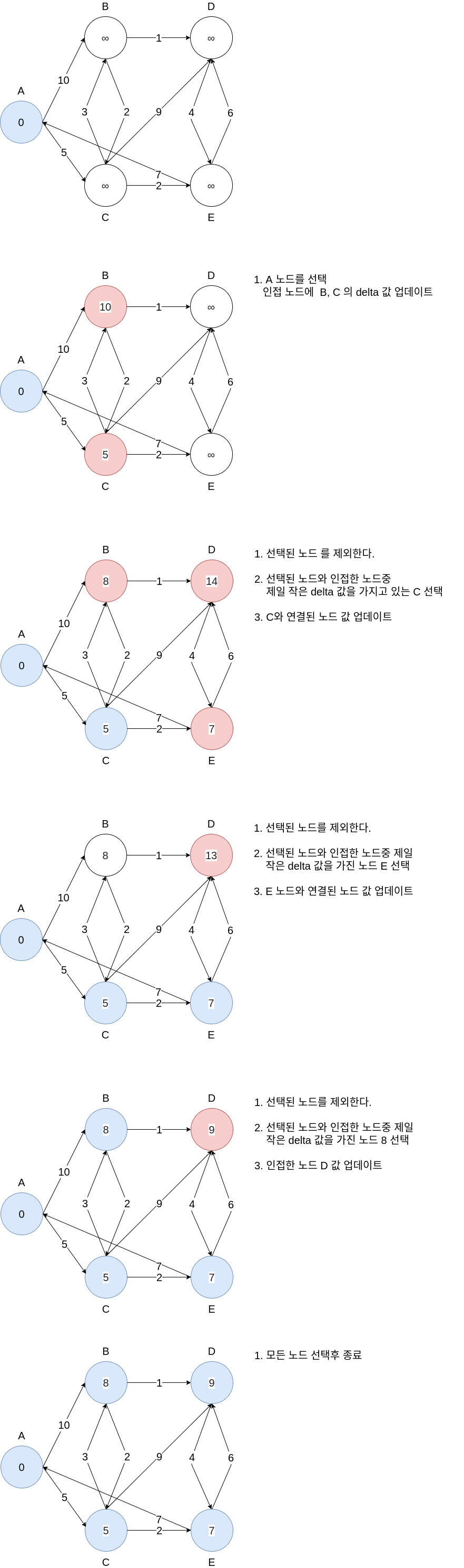 5, 2~4 번을 반복한다. 모든 노드가 집합 S 에 추가 되면 종료한다.