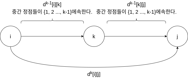 - i~j 까지의 거리 값이다 1~K 까지 속한 노드들만 거쳐간다.