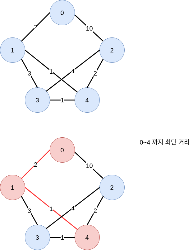 아래 그래프에서 0 번 노드에서 4번 노드의 최단거리는