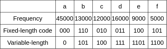 - Fixed-length code: 문자를 표현하기 위해 3bit 가 필요하므로 300,000비트가 된다.