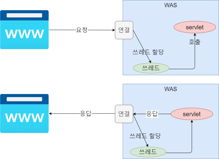 - 쓰레드를 할당 받아 해당 서블릿을 쓰레드가 수행하게 된다.