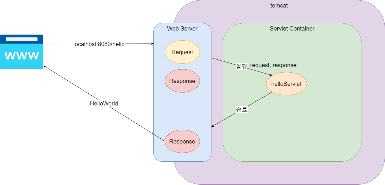 - 요청이 오면 웹서버에서 request, response 객체를 만든다.