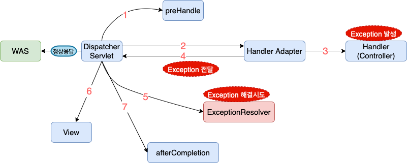 5. ExceptionResolver가 Exception 을 가로채어 해결시도를 한다.