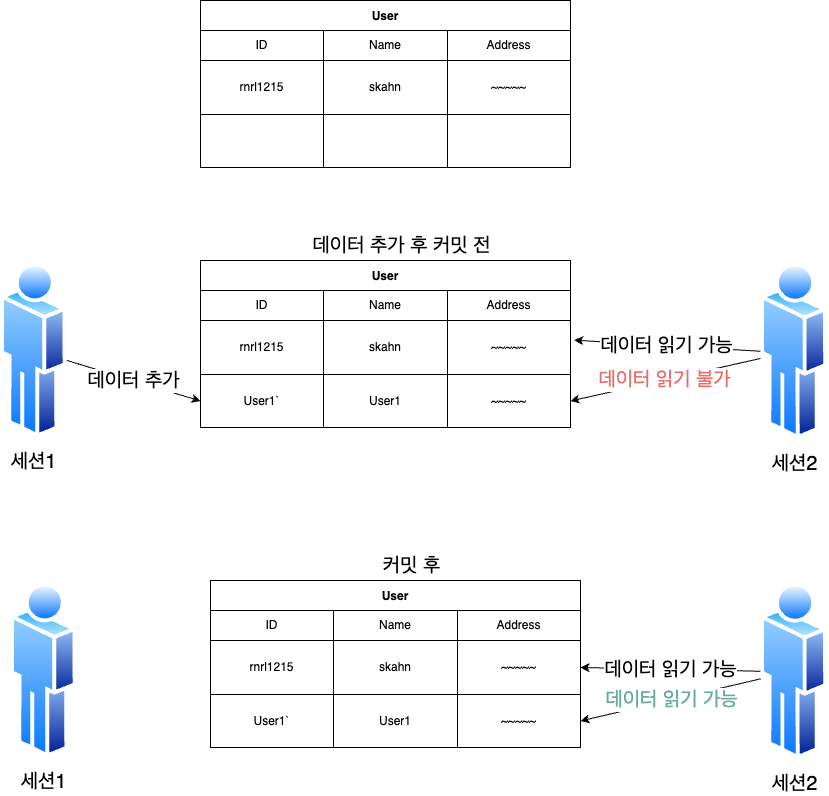 - 세션2: 커밋이 안되어 새로 추가된 데이터를 읽지 못한다.