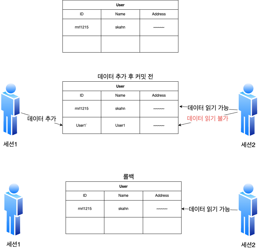 - 커밋이 안되었기 때문에 롤백시 추가한 데이터가 날라간다.