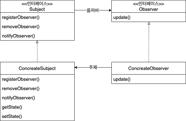 - 옵저버가 될수 있는 객체는 반드시 해당 인터페이를 구현해야 한다.