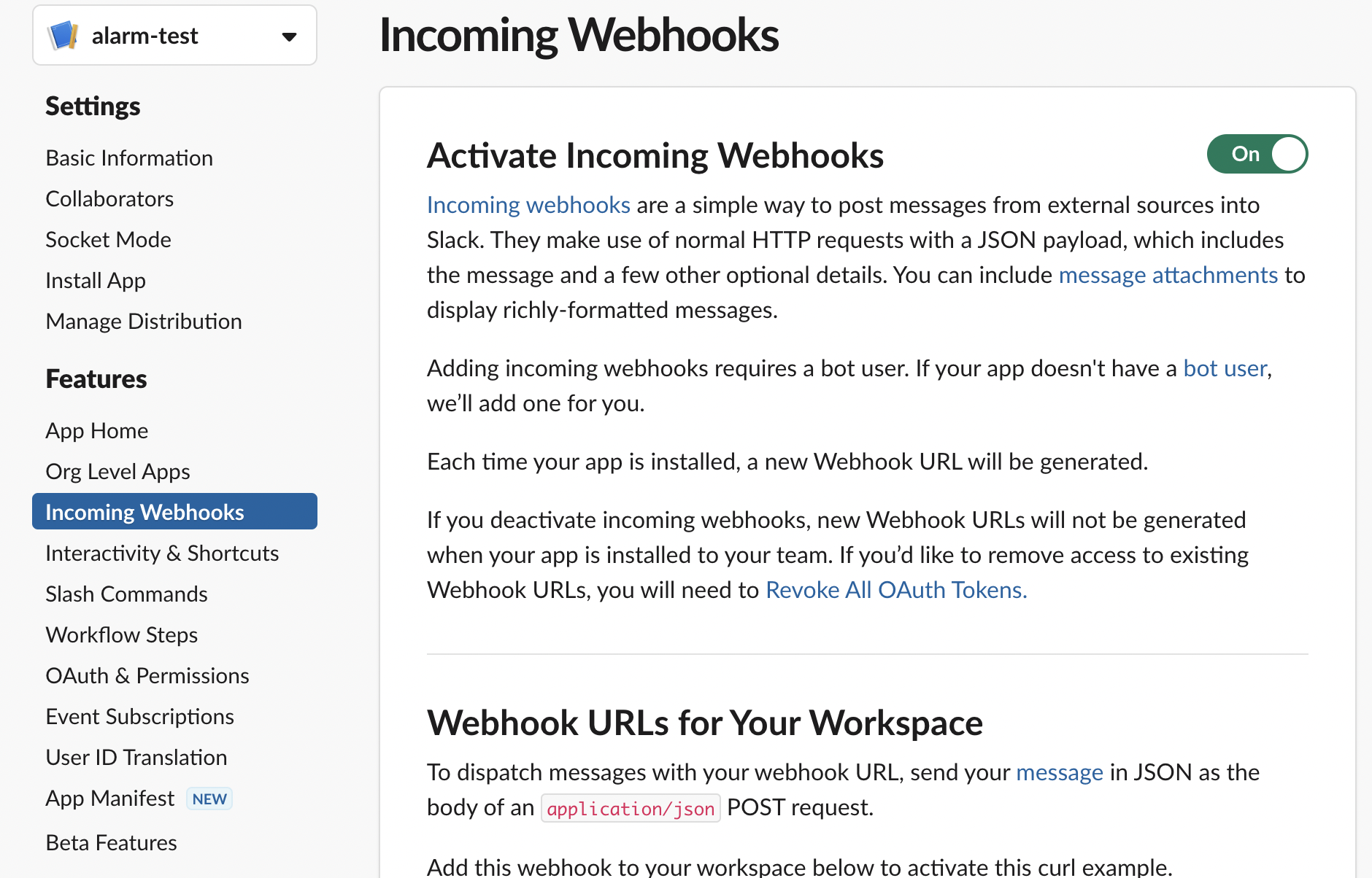 - 왼쪽 Features 에 보면 Incoming WebHook 이라는 메뉴가 있다 들간다음에