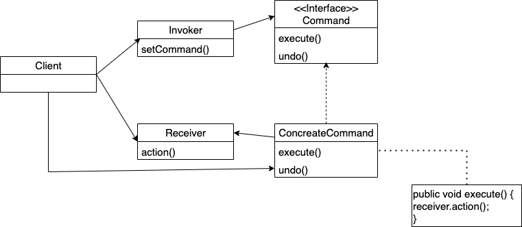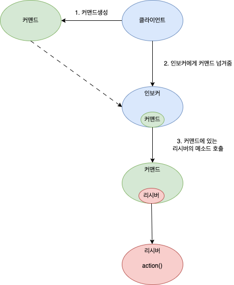 - 커맨드객체에는 행동과 리시버의 정보를 가지고 있다. - 클라이언트는 인보커 객체의 setCommand 메소드를 호출한다