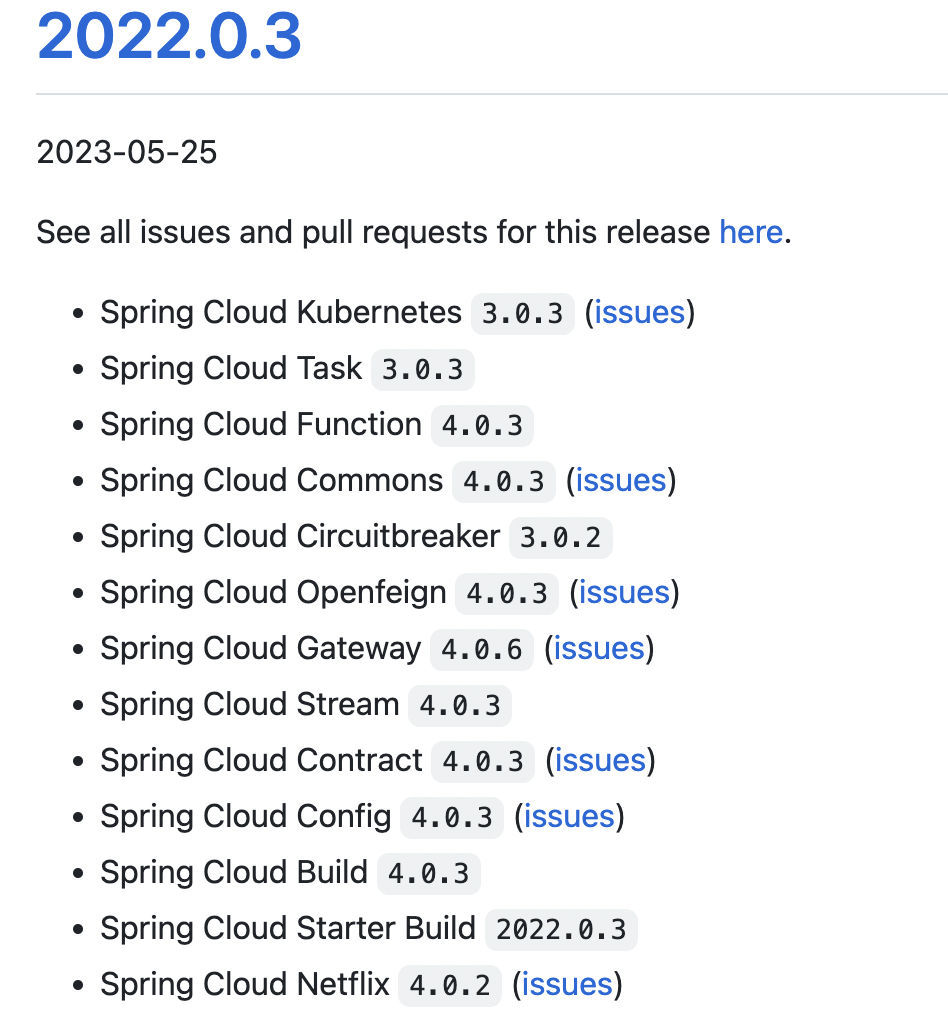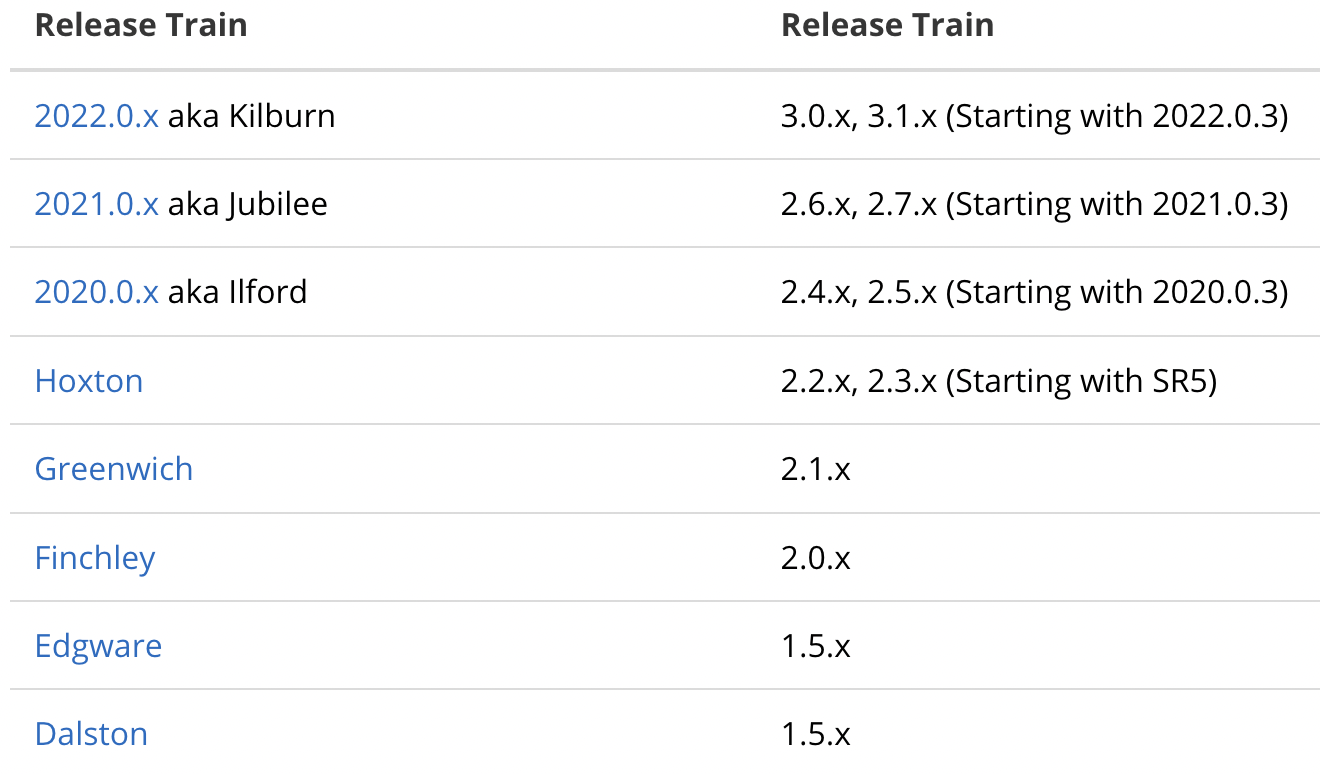 - 아래 표를 보면 스프링 부트 3.0.x 버전에는 2022.0.x 릴리스가 호환성에 맞는 버전이라고 생각하면된다.