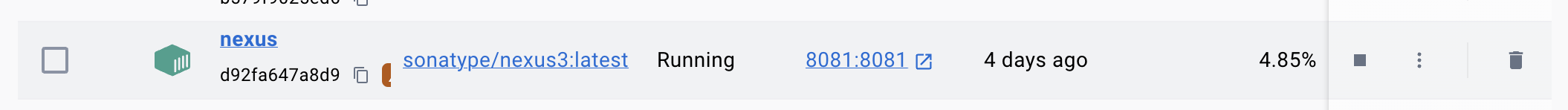 - nexus 가 정상적으로 띄어졌으면 아래와 같이 초록색으로 띄워진 컨테이너를 확인 할수있다.