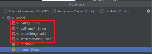 빨간 고추아이콘으로 getter, setter가 보인다.