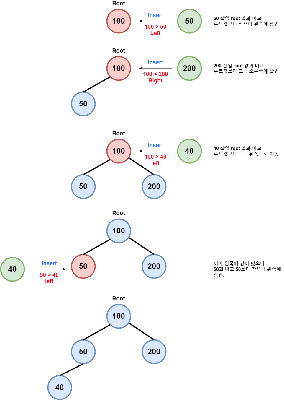 - 50 을 넣을때 100 과 비교한다. 부모보다 작기 때문에 왼쪽에 추가해준다.