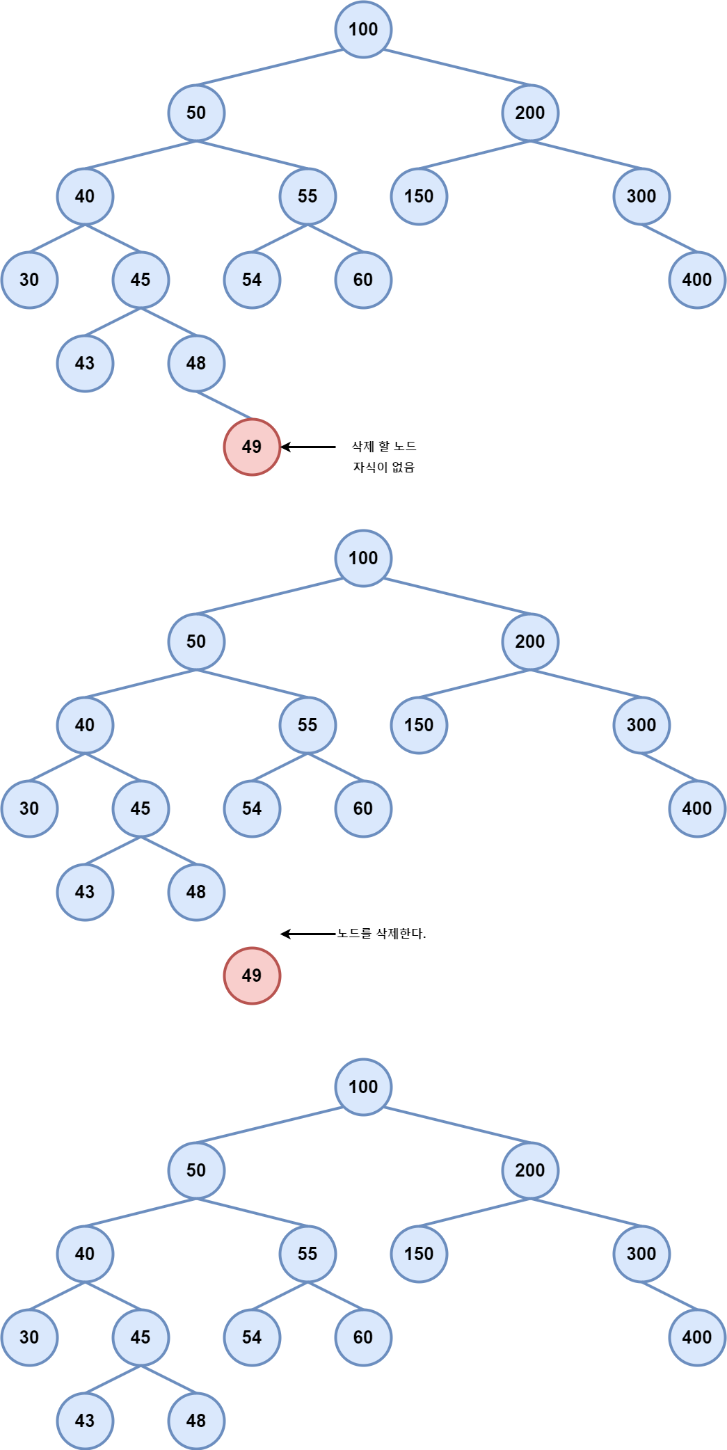제일 간단하다 그냥 삭제노드와 삭제노드의 부모와 연결을 끊어준다.