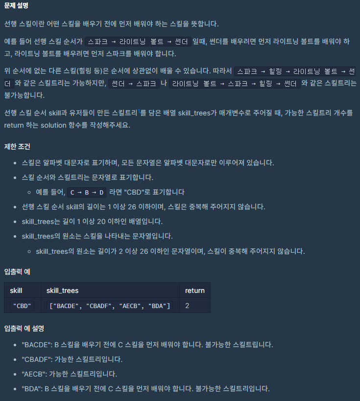 skill_trees의 BACDE 에서 C, B, D 각각의 index를 찾는다.