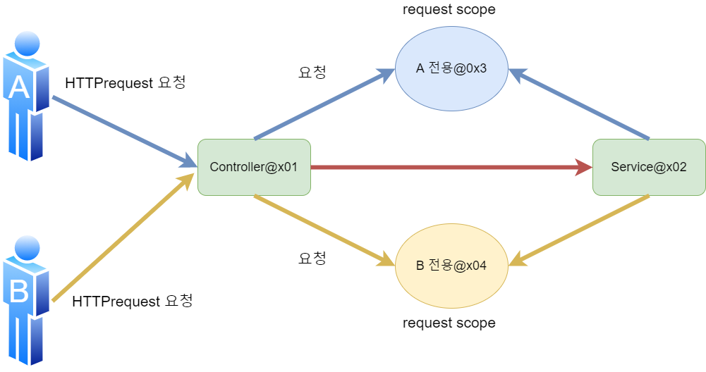 - Request: HTTP 요청 하나가 들어오고 나갈 때 까지 유지되는 스코프