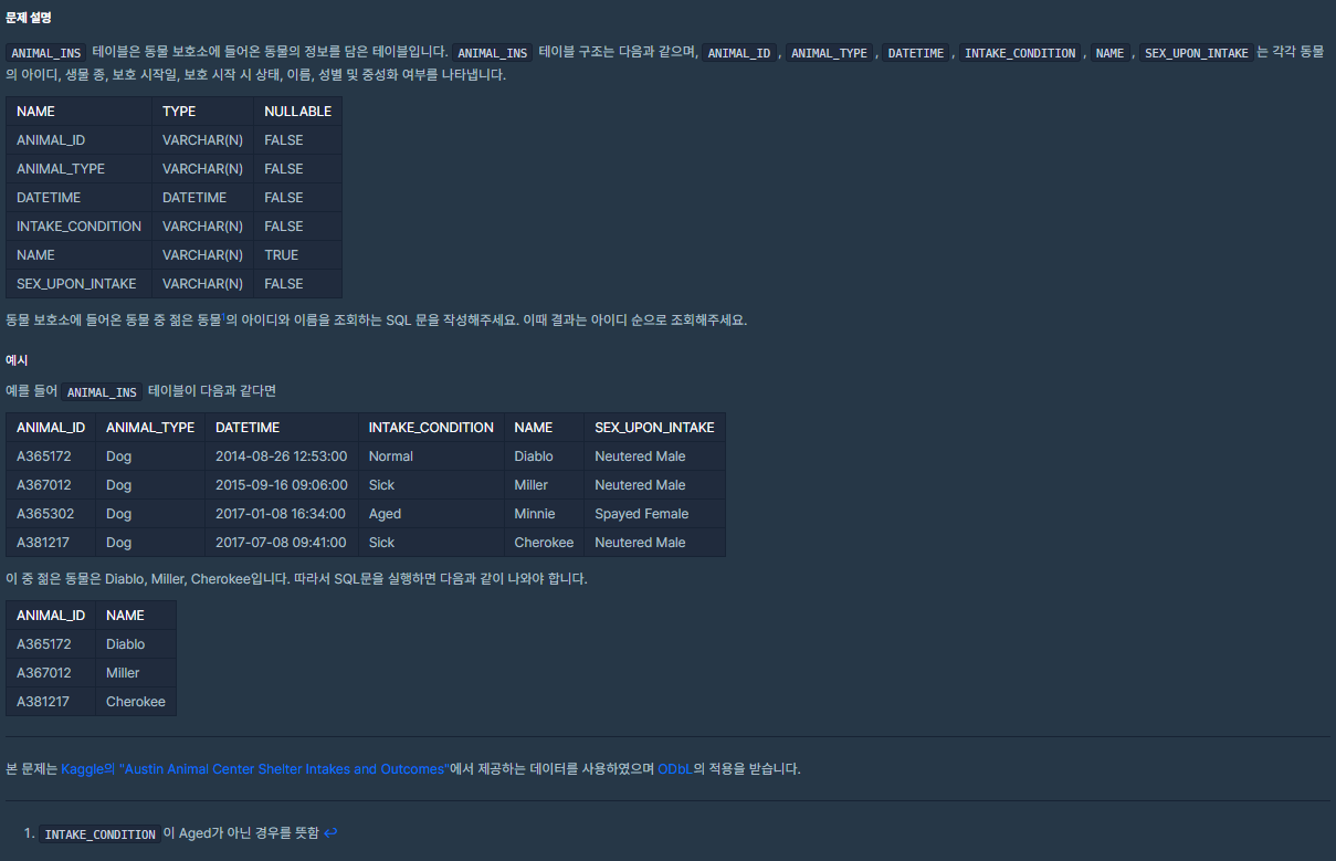 ANIMAL_INS 테이블은 동물 보호소에 들어온 동물의 정보를 담은 테이블입니다. ANIMAL_INS 테이블 구조는 다음과 같으며, ANIMAL_ID, ANIMAL_TYPE, DATETIME, INTAKE_CONDITION, NAME, SEX_UPON_INTAKE는 각각 동물의 아이디